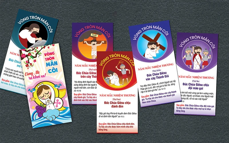 Nếu thiết kế tập sách nhỏ về Kinh Mân Côi đã khá quen thuộc với chúng ta, thì có lẽ Flash Card sẽ mới mẻ hơn nhiều. Thay vì một tập sách nhỏ chứa đựng đủ 20 mầu nhiệm Mân Côi, thì trong bộ FlashCard này sẽ là những tấm thẻ bài riêng biệt, mỗi tấm in một mầu nhiệm mân côi.
